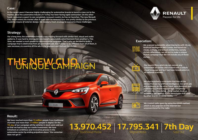 Automotive commercials have focused on similar audio and visual codes for a long time. To describe the unique features of Renault Clio 5 couldn’t be possible by creating an advertising campaign that repeats the same cliches. So, we examine the automotive advertising history with AI first, then get rid of all the cliches.