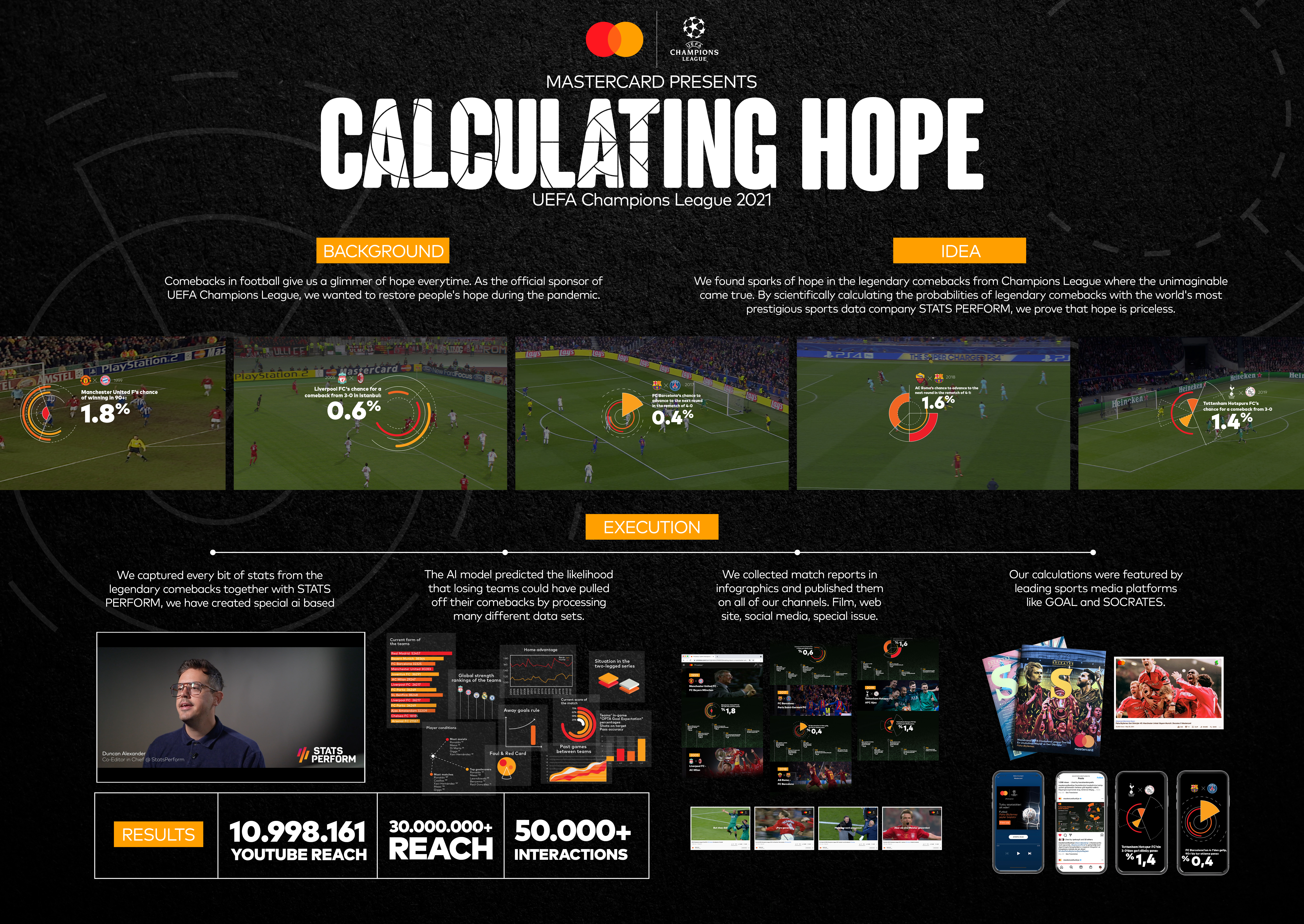 For the last two years, Covid 19 has affected the global economy, sports, daily life, and most importantly, our mood. Mastercard, the official sponsor of the UEFA Champions League, wanted to give hope to the world through the Champions League Final 2021. The history of the Champions League is also a history of extraordinary comebacks. So we focused on these legendary comebacks by scientifically calculating the probability of the tournament’s most astonishing comebacks. And we showed that there is hope even in the most challenging moments.