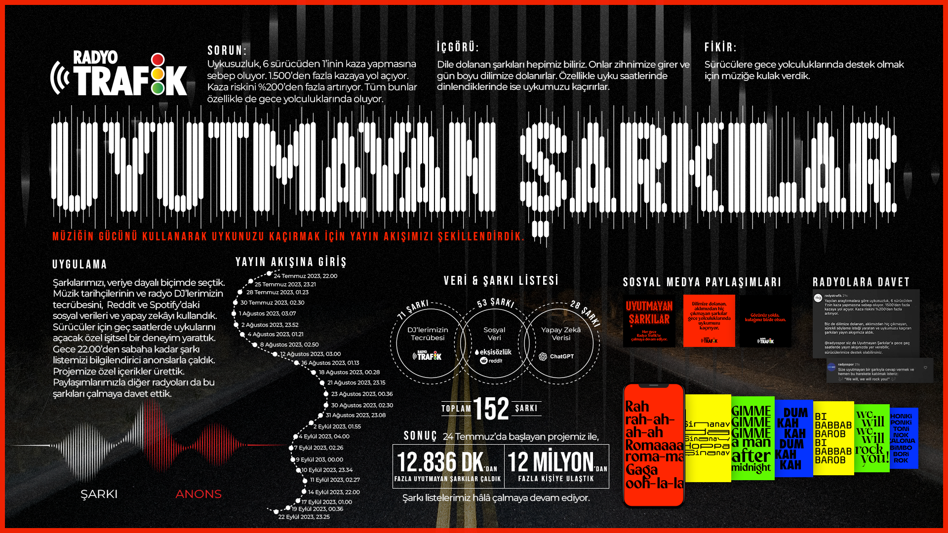 Lack of sleep causes 1 out of 6 drivers to have an accident. It leads to more than 1,500 accidents. It increases crash risk by more than 200%. All of this mostly happens during night drives. We all know earworm songs. They get into our minds and stick to our tongues all day long. Especially when listened to during sleep hours, they keep us awake. We listened to music to support drivers on their night journeys.