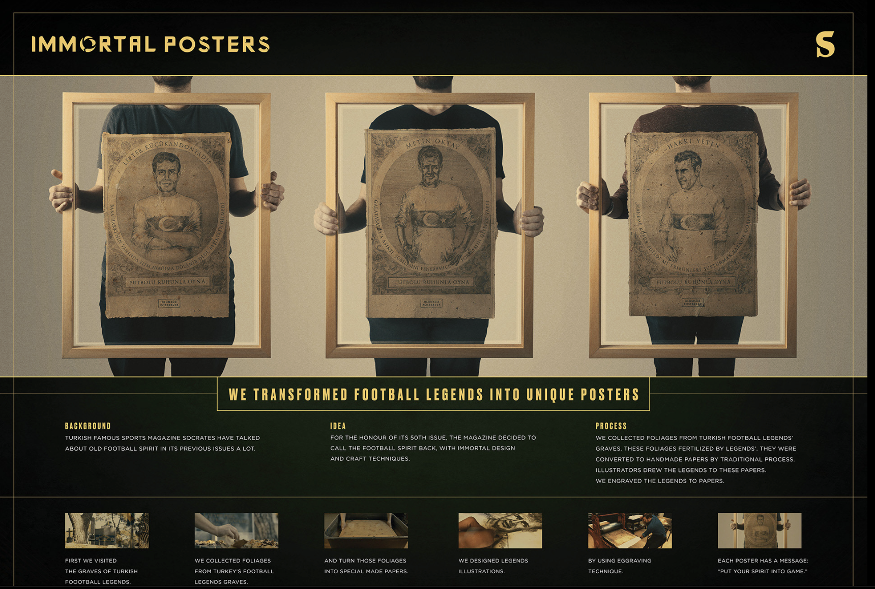 To celebrate 4th year of Socrates Magazine we decided to take football spirit, which the magazine often focuses on, and make an embodiment of it. Three legendary names of Turkish football: Metin Oktay, Lefter Küçükandonyanis and Hakki Yenen, who created Turkish football spirit with their talents and characters. These three names, have played in Turkey’s most famous three Football Clubs; Galtasaray , Fenerbahçe and Besiktas, and have left immortal marks in Turkish Football history. There were a piece of them in the trees that grew next to their graves…Socrates Magazine, visited the graves of these three legends. During the visit, we collected the leaves that fell on the graves. We created a project where the leaves could transform and remind football fans the strong emotional connection thay had: We turned the leaves into paper and those papers into immortal posters carrying the name of those Turkish football legends.