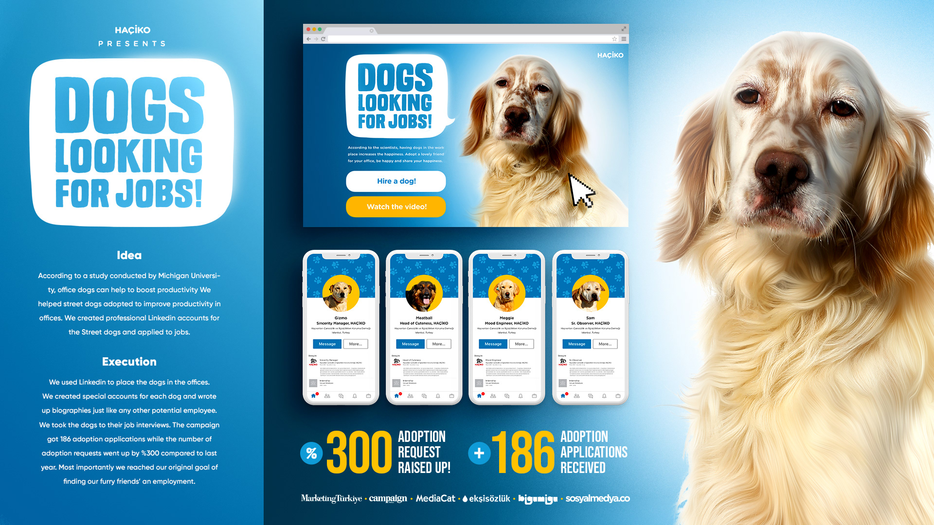According to the research led by Michigan University, “having dogs in a workplace makes employees happier and more motivated.” So we opened LinkedIn profiles for the strayed dogs to find them jobs.
