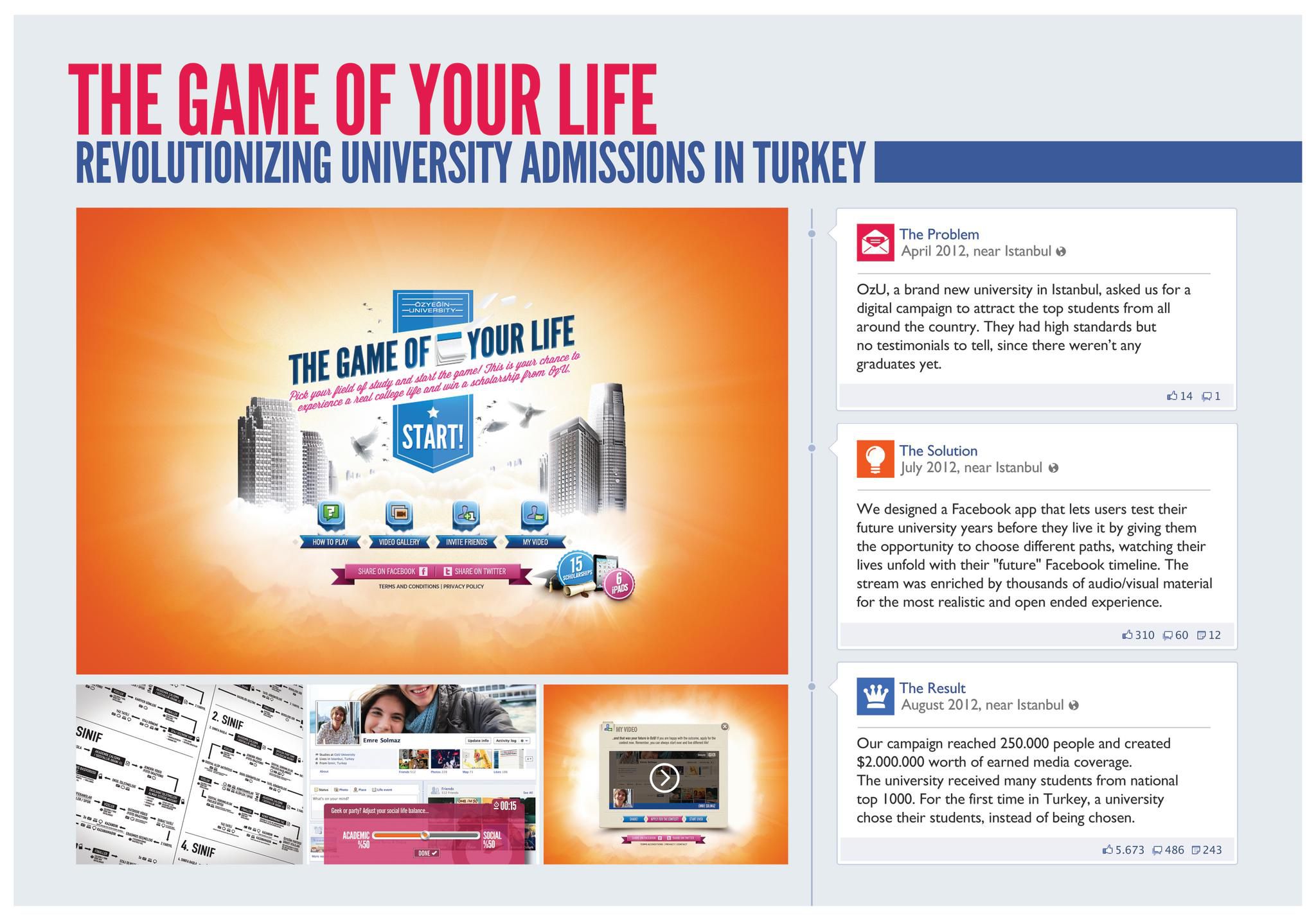 In Turkey, there’s a standard examination process called OSS for university admissions, and students' choices of university drastically affect their and their families lives. So we decided to make these students understand the importance of this life-changing decision through their familiar medium: their Facebook timeline.
