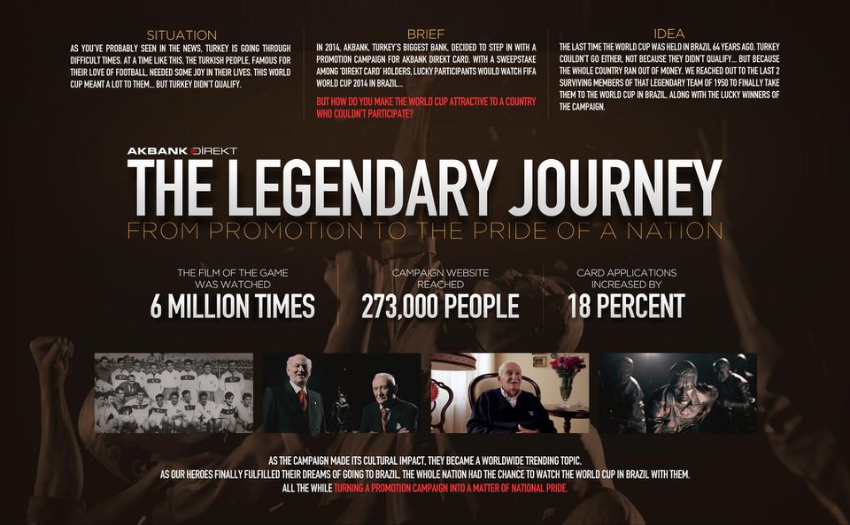 In 2014, Turkey didn’t qualify for the World Cup in Brazil. The last time the World Cup was held in Brazil was 64 years ago. Turkey couldn’t go either, not because they didn’t qualify, but because the whole country ran out of money… So Akbank, Turkey’s biggest bank, decided to step in. Using a promotional campaign, they wanted to give everyone in Turkey the chance to realize their dreams. And provide the winners with the opportunity to join the last two surviving members of that legendary team of 1950, as we finally took them to the World Cup in Brazil.